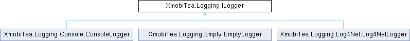Implemented in XmobiTea.Logging.Console.ConsoleLogger, XmobiTea.Logging.Empty.EmptyLogger, and XmobiTea.Logging.Log4Net.Log4NetLogger.
