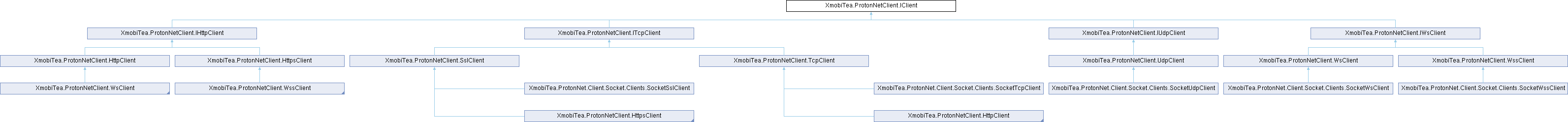 Implemented in XmobiTea.ProtonNetClient.SslClient, XmobiTea.ProtonNetClient.TcpClient, XmobiTea.ProtonNetClient.UdpClient, XmobiTea.ProtonNetClient.WsClient, and XmobiTea.ProtonNetClient.WssClient.